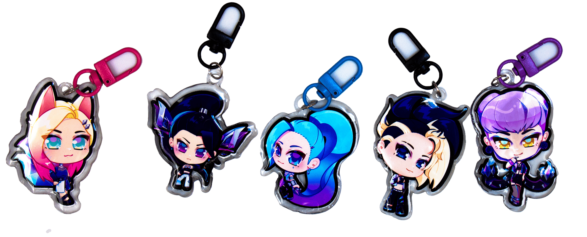 Handmade resin keychains of Ahri, Kai'Sa, Seraphine, Akali, and Evelynn from the K/DA All Out skin line!